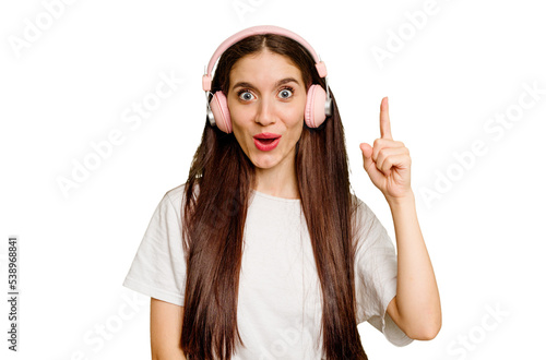 Young caucasian woman wearing headphones isolated having some great idea, concept of creativity.
