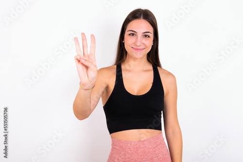 Young caucasian woman wearing sportswear over white background showing and pointing up with fingers number three while smiling confident and happy.