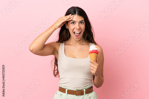 Young caucasian woman with a cornet ice cream isolated on pink background with surprise expression