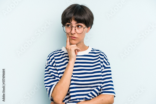 Young caucasian woman with a short hair cut isolated contemplating, planning a strategy, thinking about the way of a business.