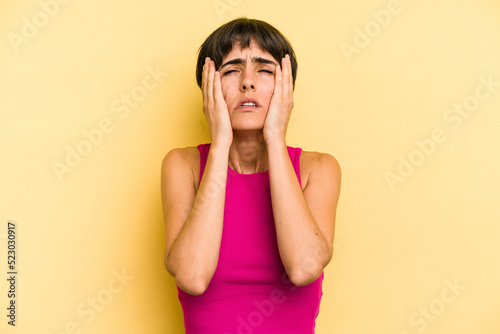 Young caucasian woman with a short hair cut isolated whining and crying disconsolately.