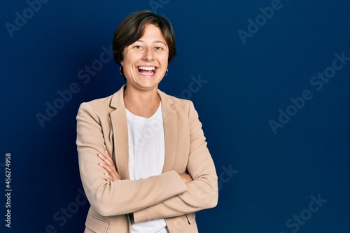 Young caucasian woman with arms crossed gesture smiling and laughing hard out loud because funny crazy joke.