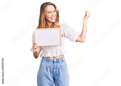 Young caucasian woman with blond hair holding blank empty banner screaming proud, celebrating victory and success very excited with raised arms