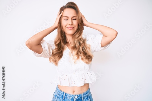Young caucasian woman with blond hair wearing casual summer clothes suffering from headache desperate and stressed because pain and migraine. hands on head.