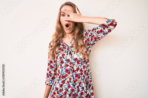 Young caucasian woman with blond hair wearing summer dress peeking in shock covering face and eyes with hand, looking through fingers with embarrassed expression.