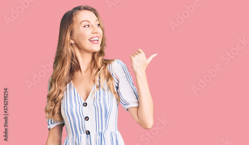 Young caucasian woman with blond hair wearing summer dress smiling with happy face looking and pointing to the side with thumb up.