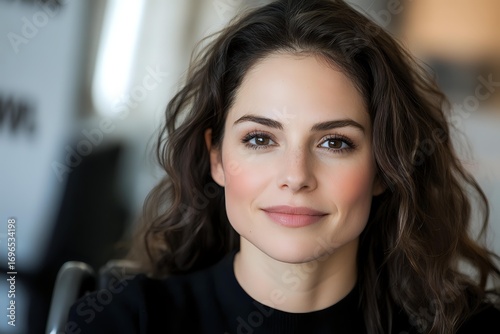 Young Caucasian woman with dark wavy hair and natural makeup wearing black sweater smiles warmly at camera in soft natural lighting, expressing confidence and approachability.