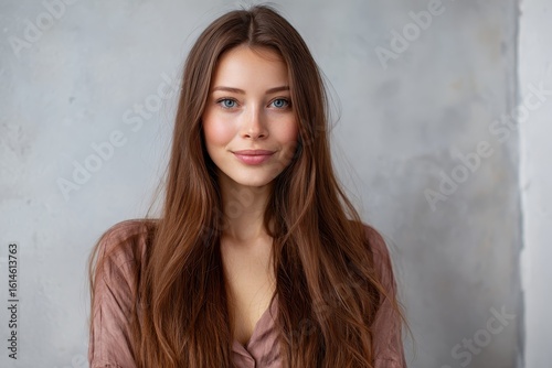 Young Caucasian woman with long brown hair poses against a textured gray background during a quiet indoor moment capturing natural beauty and elegance