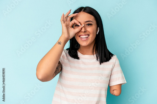 Young caucasian woman with one arm listening to music with wireless headphones isolated on blue background excited keeping ok gesture on eye.
