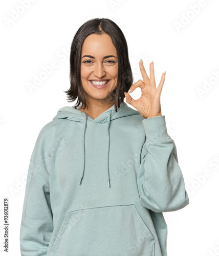 Young Caucasian woman with short hair cheerful and confident showing ok gesture.
