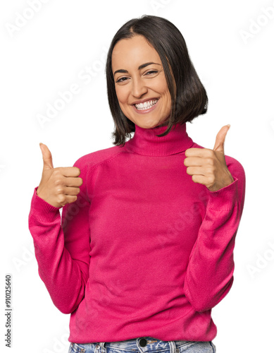 Young Caucasian woman with short hair raising both thumbs up, smiling and confident.