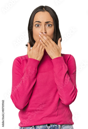 Young Caucasian woman with short hair shocked, covering mouth with hands, anxious to discover something new.