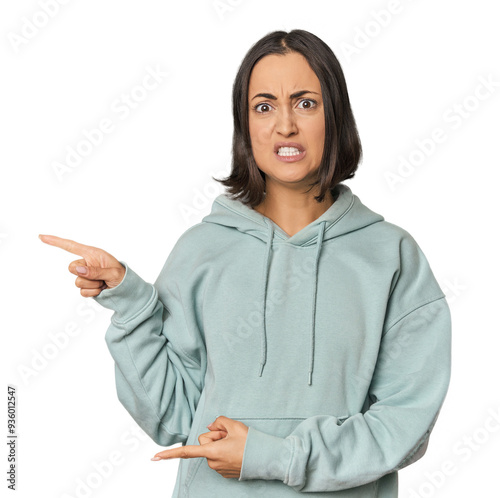 Young Caucasian woman with short hair shocked pointing with index fingers to a copy space.