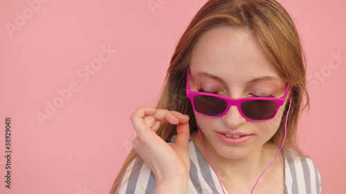 Young caucasian woman with sunglasses listening to the music using headphones . Isolated on pink background, close up. High quality photo