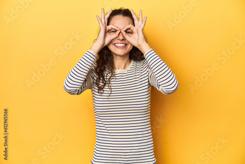 Young Caucasian woman, yellow studio background, showing okay sign over eyes