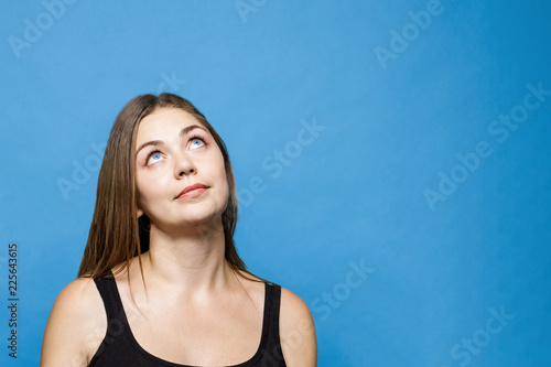 Young causacian woman with blue eyes up thinks or dreams about something. Dark hair, isolated on blue background, studio, model, copy space.