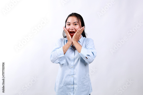 Young cheerful asian woman look with surprised face at camera, react to awesome good news, smiling and cheering, standing against white background