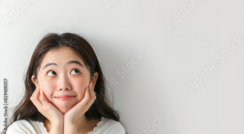 Young cheerful Asian woman looking up towards copy space