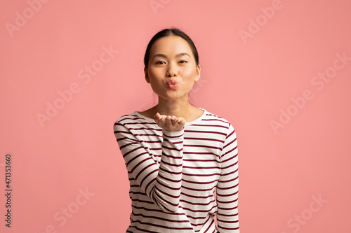Young Cheerful Asian Woman Pouting Lips And Blowing Air Kiss At Camera