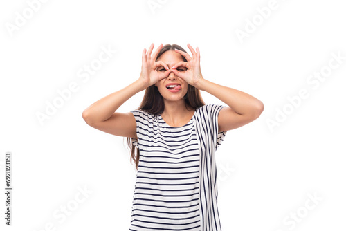 young cheerful brunette lady with straight hair in glasses is dressed in a striped t-shirt and jeans makes a grimace on a white background with copy space
