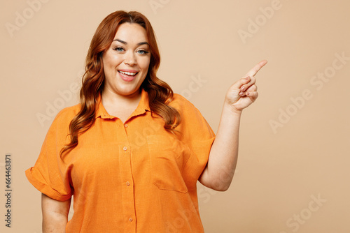Young cheerful ginger chubby overweight woman wear orange shirt casual clothes point index finger aside indicate on area isolated on plain pastel beige background studio portrait. Lifestyle concept.