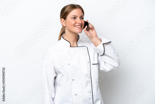 Young chef woman isolated on white background keeping a conversation with the mobile phone