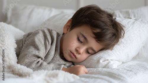 Young child peacefully sleeping on soft pillows in a cozy bedroom during daytime