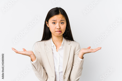 Young chinese business woman isolated confused and doubtful shrugging shoulders to hold a copy space.