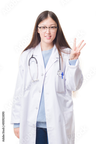 Young Chinese doctor woman over isolated background showing and pointing up with fingers number three while smiling confident and happy.