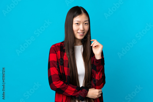 Young Chinese girl over isolated blue background laughing