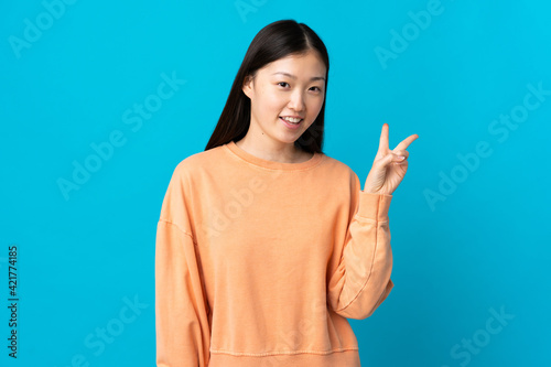 Young Chinese girl over isolated blue background smiling and showing victory sign