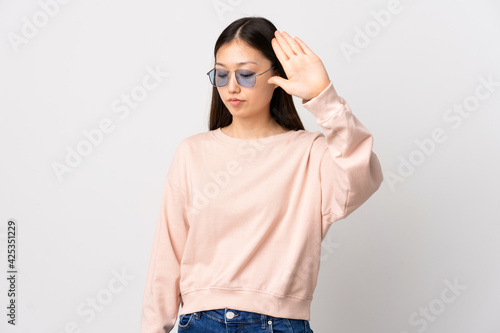Young Chinese girl over isolated white background making stop gesture and disappointed