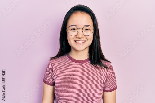 Young chinese girl wearing casual clothes and glasses with a happy and cool smile on face. lucky person.