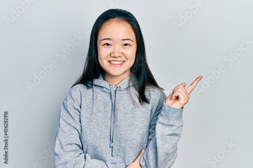 Young chinese girl wearing casual clothes smiling happy pointing with hand and finger to the side