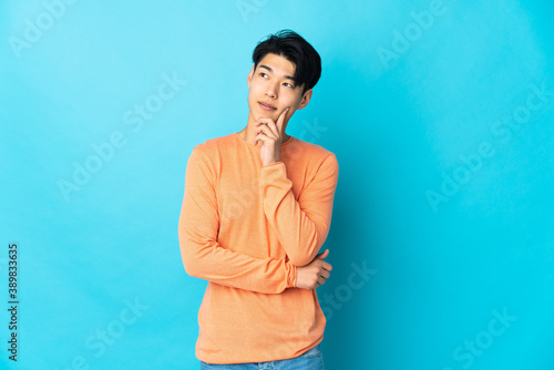 Young Chinese man isolated on blue background thinking an idea while looking up