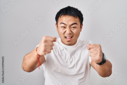 Young chinese man standing over white background angry and mad raising fists frustrated and furious while shouting with anger. rage and aggressive concept.