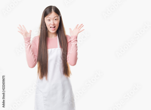 Young Chinese shop owner woman over isolated background wearing white apron very happy and excited, winner expression celebrating victory screaming with big smile and raised hands