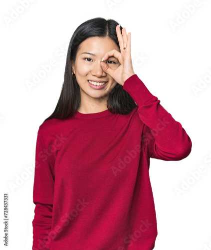 Young Chinese woman in studio setting excited keeping ok gesture on eye.