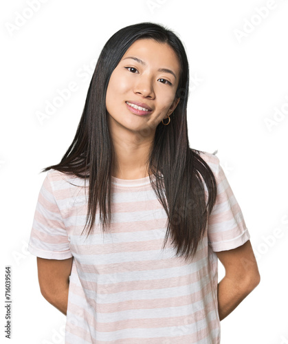 Young Chinese woman in studio setting happy, smiling and cheerful.