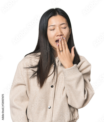 Young Chinese woman in studio setting yawning showing a tired gesture covering mouth with hand.