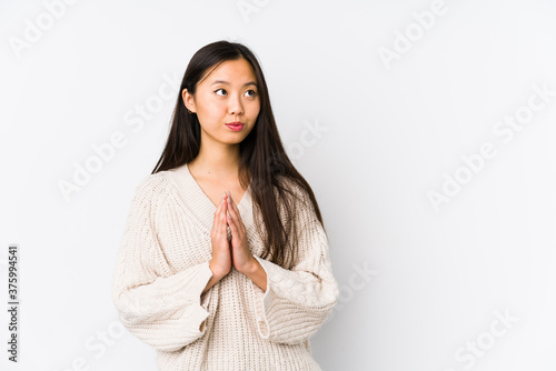 Young chinese woman isolated making up plan in mind, setting up an idea.