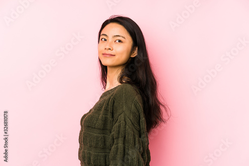 Young chinese woman isolated on a pink background looks aside smiling, cheerful and pleasant.