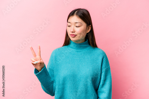 Young Chinese woman isolated on pink background joyful and carefree showing a peace symbol with fingers.
