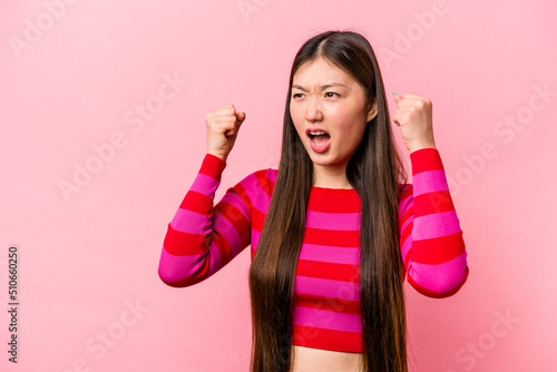 Young Chinese woman isolated on pink background raising fist after a victory, winner concept.
