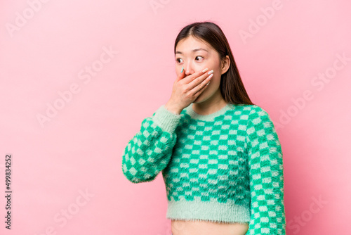 Young Chinese woman isolated on pink background thoughtful looking to a copy space covering mouth with hand.