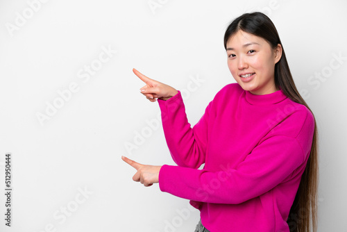 Young Chinese woman isolated on white background pointing finger to the side and presenting a product