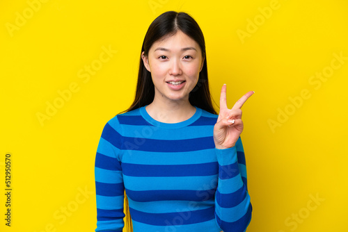 Young Chinese woman isolated on yellow background smiling and showing victory sign