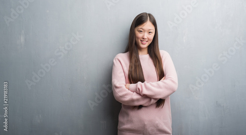 Young Chinese woman over grey wall happy face smiling with crossed arms looking at the camera. Positive person.