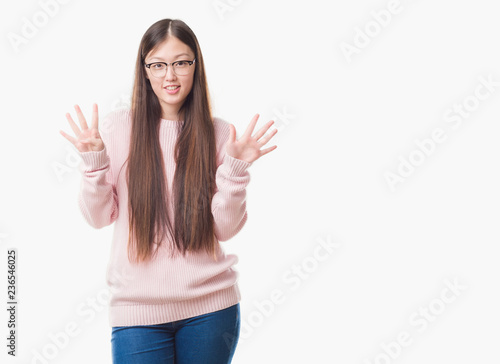 Young Chinese woman over isolated background wearing glasses showing and pointing up with fingers number nine while smiling confident and happy.
