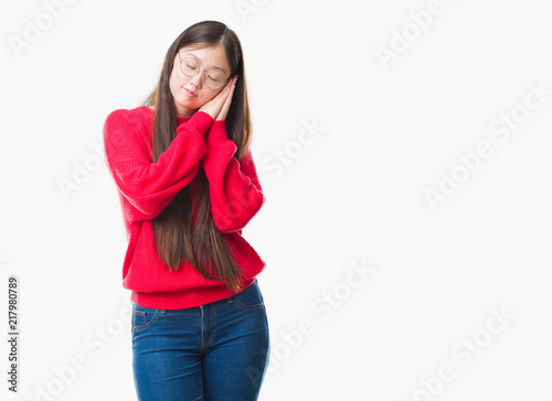 Young Chinese woman over isolated background wearing glasses sleeping tired dreaming and posing with hands together while smiling with closed eyes.